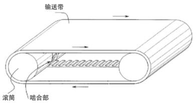 如圖1所示,輸送帶內表面的齒以相同的間隔向傳動側的外部延伸,每對齒的形狀為人字形條紋,也可以是魚骨形條紋;驅動滾筒則采用圖1左圖的結構,輸送帶上的條紋與驅動滾筒上的溝紋相嚙合。由于傳動結束表面傾向于輸送帶的行進方向,上述嚙合結構可以固有的引導并防止輸送帶橫向偏移。